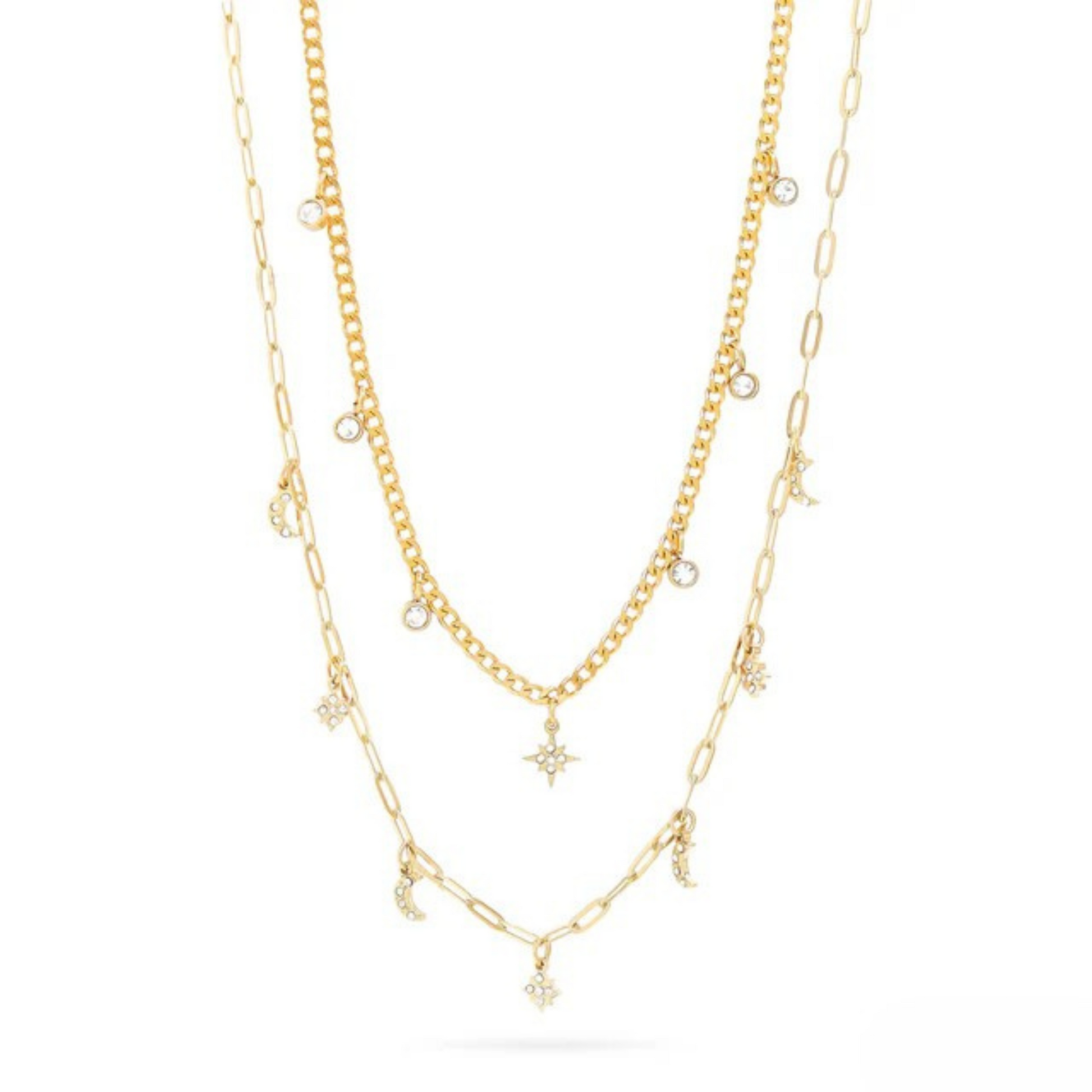 Discover our Luminary Two-Way Necklace, a must-have accessory featuring astral-inspired charms embellished with sparkling pavé stones. This versatile piece effortlessly transitions from a chic layered look to two necklaces, allowing you to express your style.