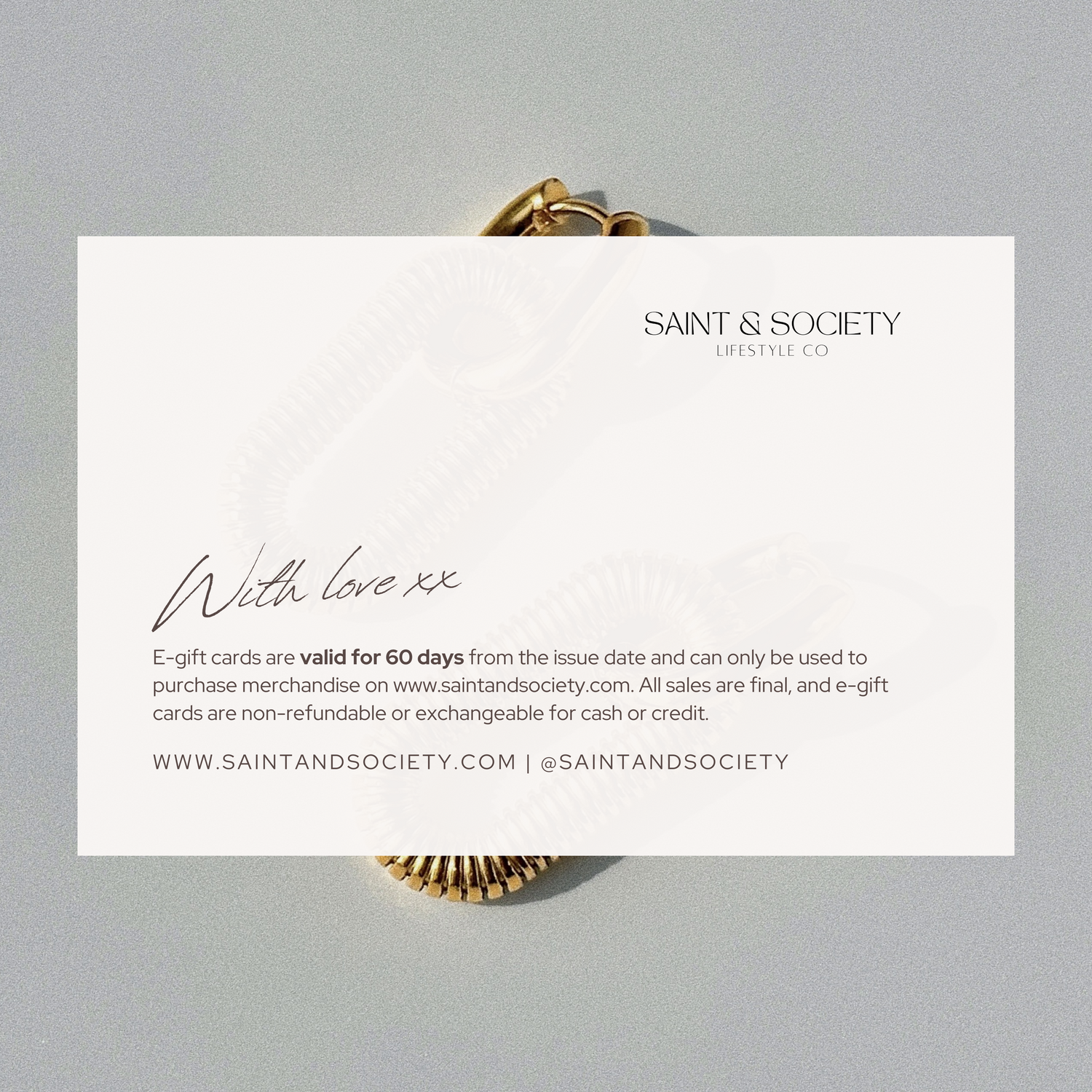 Please Note: E-gift cards are valid for 60 days from the issue date and can only be used to purchase merchandise on www.saintandsociety.com. All sales are final, and e-gift cards are non-refundable or exchangeable for cash or credit.